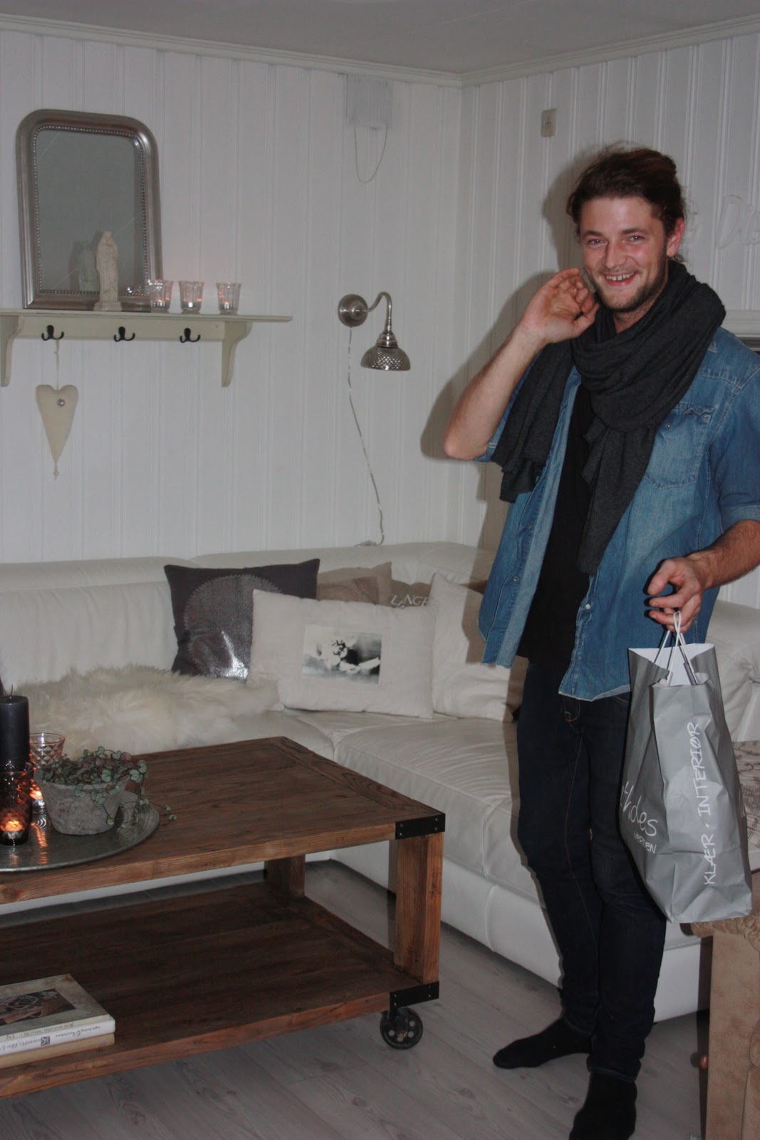 Supertøft bord fra Nordal som røffer opp stilen og bryter opp blandt mye hvitt. Stort fat med lys og pynt gjør det lunt og koselig.